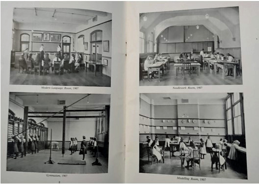 Two schools in one building. The girls and boys had separate wings but shared usage of some of the specialist rooms such as the gym and laboratories. Pictured above are the Modern Language Room, Needlework Room, Gymnasium, and Modelling Room. |
