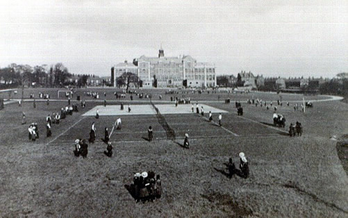 When the school opened it was a soccer school. Rugby was introduced as the winter game in 1926! Looks like the tennis courts were originally 1 grass & 1 clay. In summer I spent most lunchtimes & many happy hours after school on these courts. I am told the courts are still there(100 years after this photo) but disused and overgrown. The tarmac perimeter path around the sports field was there from day1.